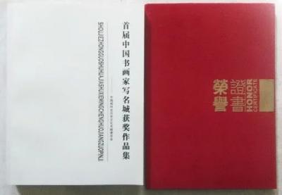 陈春收到首届书画家写名城全国展证书、作品集和奖金