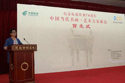 河南伊川实力派书法家、中国当代书法名家一一张进旭,在总政治部纪念抗战胜利70周年一一当代艺术名家主题邮品首发式频奖证书活动现场。