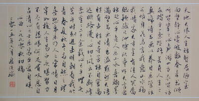 心曲夏侯瑜1990年秋初稿天地无垠,人生短暂。居陋室,面壁静心,读破数卷奇书,倾听贤辈之心声;游四方,求贤访友,踏平一条险路,苦觅人生之真谛。诗书画以养目,乐管弦可怡耳。花鸟言我意,山水移我情。家无寸金,有佳人笑靥,聪颖骏儿。池塘玩童好无言、爱独处;心平老人乐山水、喜翰墨。满壁书画清香溢,默然无语胜