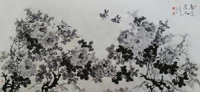 蔡茂友巨幅水墨牡丹《鸟语花香》2.3米X1.1米近日,当代书画名家蔡茂友创作完成的巨幅水墨牡丹画《鸟语花香》,长2.3米,宽1.1米,创下世界上已知的最大的水墨牡丹画的纪录。我们欣赏该作品,全画通篇有12朵牡丹、飞鸟、山石、蜜蜂四样,以书法用笔、精心布局、水墨写意而成。他通过墨的干湿浓淡,笔的适当交