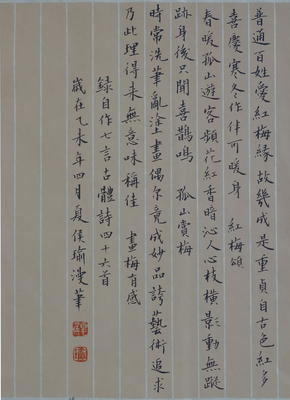 册页(10)44.咏红梅2011年6月20日普通百姓爱红梅,缘故几成是重贞。自古色红多喜庆,寒冬作伴可暖身。45.孤山赏梅2008年2月23日春暖孤山游客频,花红香暗沁人心。枝横影动无踪迹,身后只闻喜鹊鸣。46.画梅有感2008年4月时常洗笔乱涂画,偶尔竟成妙品夸。艺术追求乃此理,得来无意味称佳。