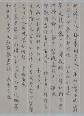 册页(7)29知天命年有感忙忙碌碌一天天,稀里糊涂又一年。两鬓不时露白发,多少梦想都成烟。30杂感2009/10/28笔走龙蛇难数年,爱观骑手挥神鞭。自学棍棒太极剑,筋骨紧随气韵先。31袁河漫步2010-6仰看闲云俯看花,清风作伴踏平沙。一群野凫东南去,引我乡愁到天涯。32.赏梅有感2007年10月