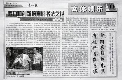 2004年3月4日《老人报》报道(张德龙书法)毅力和创新培育的书法之花——记六旬书法家张德龙2004年3月4日《老人报》报道(张德龙书法)“这位小孩子的字怎么这么漂亮啊!”“不可能吧?这些字体功力深厚,没有长久的磨炼写不出来。”“七、八岁就能写出如此大气的字,真不简单!”早春的一个清晨,广州江南少年