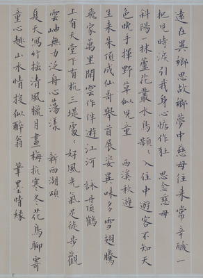 册页(5)19思念慈母2006年8月9日远在异乡思故乡,梦中慈母往来常。辛酸一把儿时泪,引我身心惦作狂。20西溪秋游斜阳一抹芦花丛,水鸟频频入住中。游客不知天色晚,手挥野草似儿童。21咏丹顶鹤生来朱顶成仙哥,举首展姿异味多。雪翅腾飞家万里,闲云作伴游江河。22新西湖颂2009-2-12上有天堂下有杭