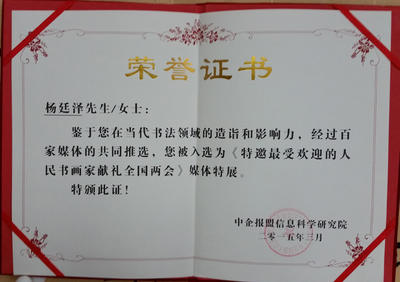 2015年3月杨廷泽入选《特邀最受欢迎的人民书画家献礼全国两会》.