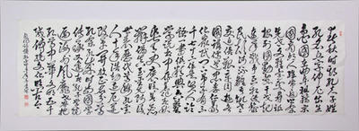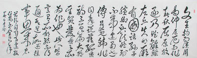 李斌自作诗《赞孔子》草书作品释文:春秋时期孔夫子,姓孔名丘字仲尼。出生鲁国在曲阜,祖籍宋国商丘人。经常返乡祭先世,“文雅台”处寻祖根。列国动乱干戈起,连年战争互相侵。黎民颠沛流离苦,饥寒交迫倍艰辛。周游各国讲儒道,忠孝仁义化众民。门下弟子有三千,七十二位是贤人。《论语》一书俱经典,“六艺”学说书中存
