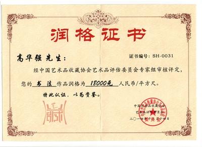 2014.12.14中国艺术品收藏协会艺术品评估委员会对高华强书法作品的润格证书