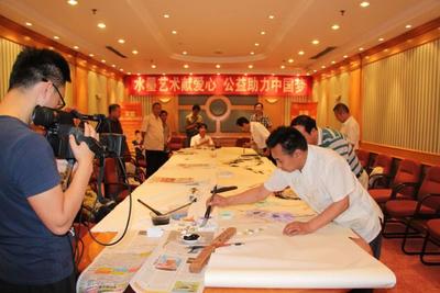 在山东电视台参加《关注不食人间烟火的孩子》大型公益活动录制现场,活动现场,十余位爱心艺家共同创作一副10余米艺术长卷,此副作品将以义拍形式为PKU患儿公益捐款,书画家王东华应邀参加了此次公益活动,并为活动现场开笔题字“爱心共铸中国梦”!(玉墨轩)