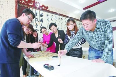 3月28日,中国书协会员、我市青年书法家张子健(右一)在给德州经济技术开发区德开小学的老师讲解毛笔字书写要领。日前,市关工委、市教育局、市书法家协会举行送书法进校园活动,组织我市优秀书法家到10所小学集中培训100名任课教师,普及书法艺术。
