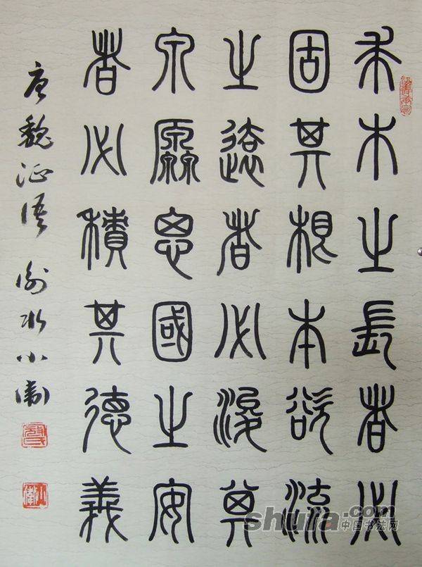篆书释文:求木之长者,必固其根本;欲流之远者,必浚其泉源;思国之安者,必积其德义。 有需要寇老师作品的朋友,请拨打【寇小卫书法工作室】助理寇天成(女士)电话: 15531811635(同微信)、 15631809143(同微信)。 欢迎全国各地的朋友到【寇小卫书法工作室】(衡水站)莅临做客、指导与洽谈业务。