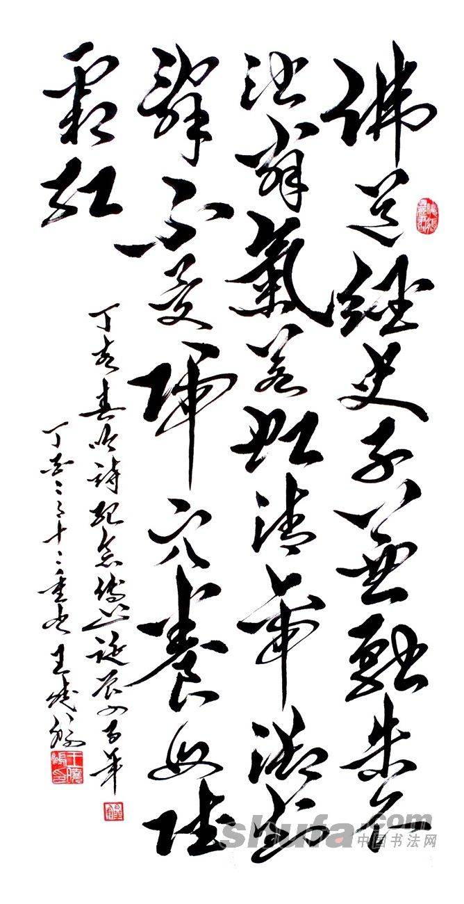 陕报王晓鹏作品,敬请点评! 作品标题:自作诗《纪念傅山》(竖式)。 原作68x136cm.释文: 佛道经史子兼融(1),朱衣浊翁(2)气若虹。 清帝御封辞不受(3),归穴养母赋《霜红》。 注:(1)傅山博通经史诸子和佛道之学,兼工诗文、书画、金石,又精医学。(2)傅山字青主,有浊翁、真山、石道人等别名。(3)康熙中征举博学鸿词,傅山被迫舁至北京,以死拒不应试。特授中书舍人,仍托老病辞归。(4)明亡后,傅山衣朱衣,居土穴中,养母,著有《霜红龛集》、《荀子评注》等。