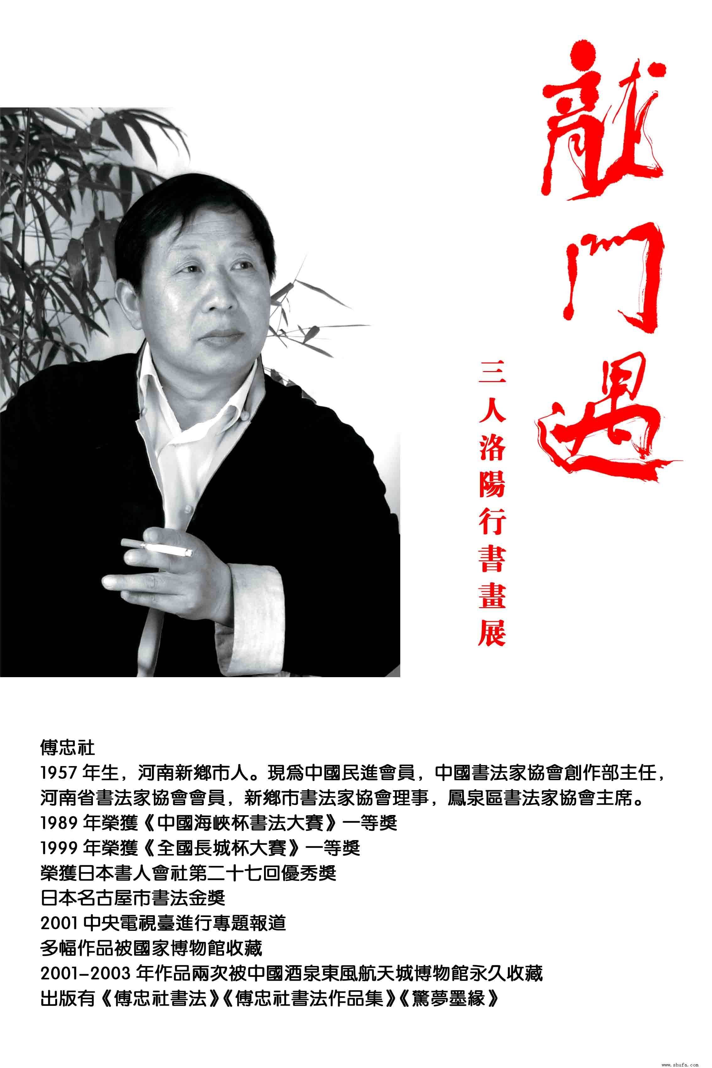 傅忠社,1957年生,河南新乡市人。现为中国民进会员,中国书法家协会创作部主任,河南省书法家协会会员,新乡市书法家协会理事,凤泉区书法家协会主席。 1989年荣获《中国海峡杯书法大赛》一等奖,1999年荣获《全国长城杯大赛》一等奖,荣获日本书人会社第二十七回优秀奖,日本名古屋市书法金奖。2001年中央电视台进行专题报道,多幅作品被国家博物馆收藏。2001-2003年作品两次被中国酒泉东风航天城博物馆永久收藏。出版有《傅忠社书法》《傅忠社书法作品集》《惊梦墨缘》。