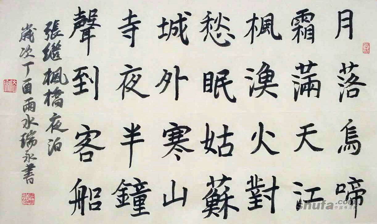 释文: 月落乌啼霜满天, 江枫渔火对愁眠。 姑苏城外寒山寺, 夜半钟声到客船。