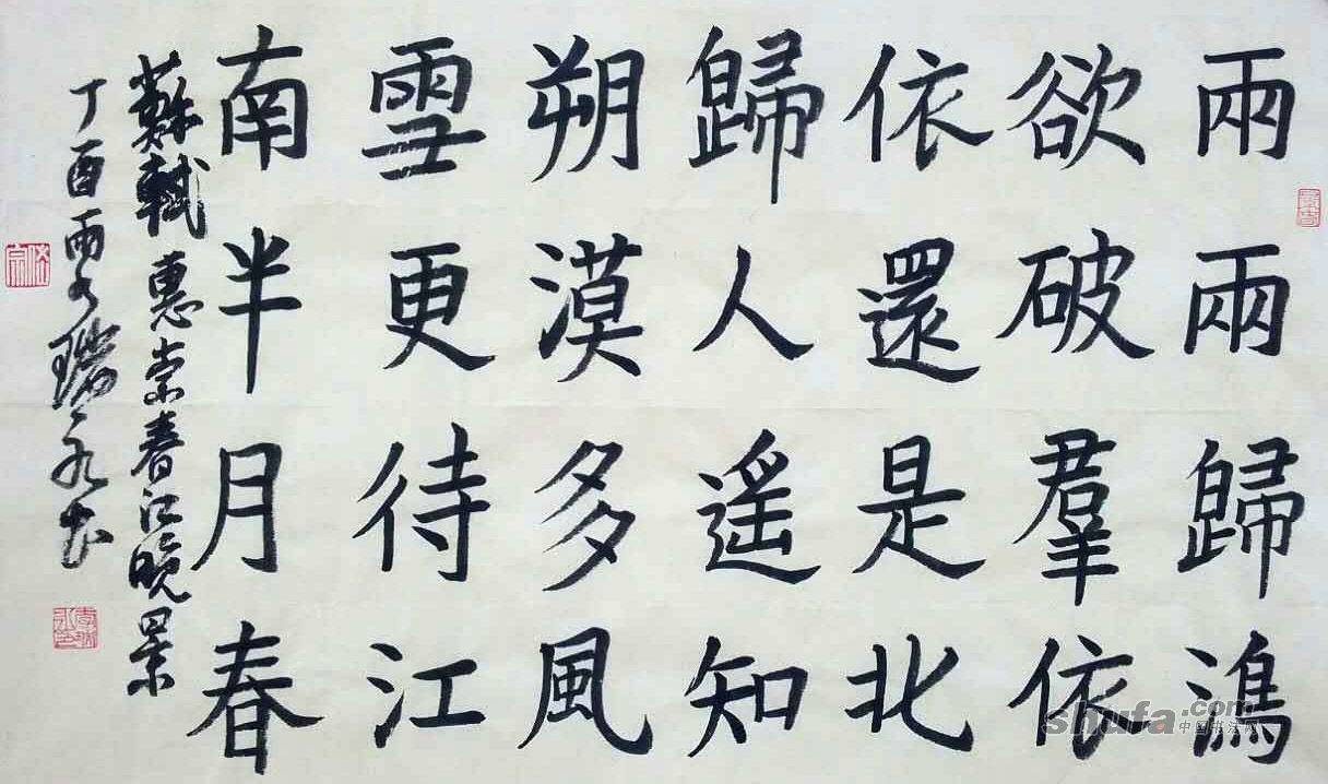 释文: 两两归鸿欲破群, 依依还是北归人。 遥知朔漠多风雪, 更待江南半月春。
