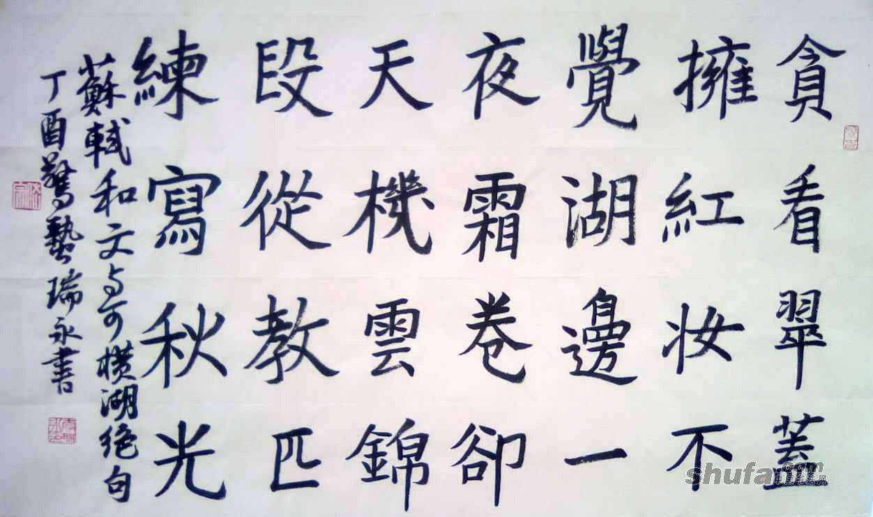 释文: 贪看翠盖拥红妆, 不觉湖边一夜霜。 卷却天机云锦段, 从教匹练写秋光。