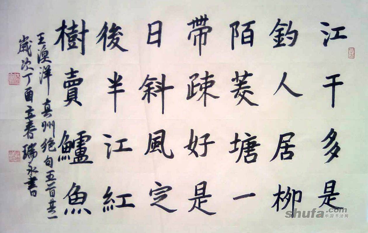 特制仿绢纸,胡开文墨锭。 释文: 江干多是钓人居, 柳陌菱塘一带疎。 好是曰斜风定后, 半江红树卖鲈鱼。