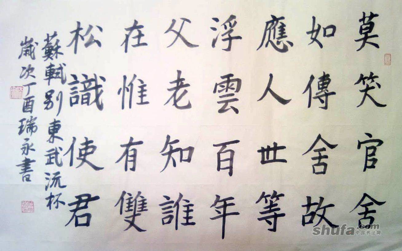 特制仿绢纸,胡开文墨锭。 释文: 莫笑官舍如传舍, 故应人世等浮云。 百年父老知谁在, 惟有双松识使君。