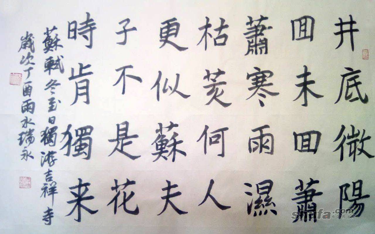 特制仿绢纸,胡开文墨锭。 释文: 井底微阳回未回, 萧萧寒雨湿枯荄。 何人更似苏夫子, 不是花时肯独来。