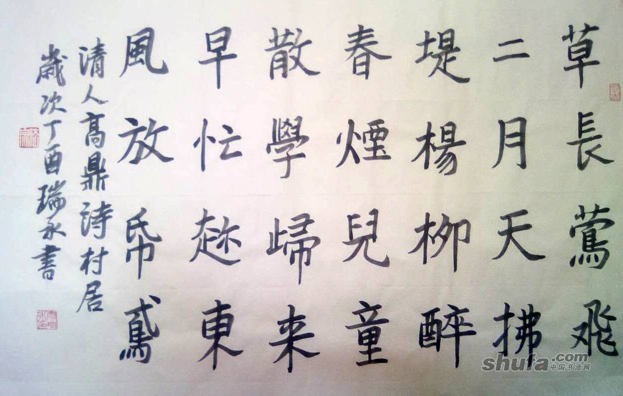 特制仿绢纸,胡开文墨锭。 释文: 草长莺飞二月天, 拂堤杨柳醉春烟。 儿童散学归来早, 忙趁东风放纸鸢。