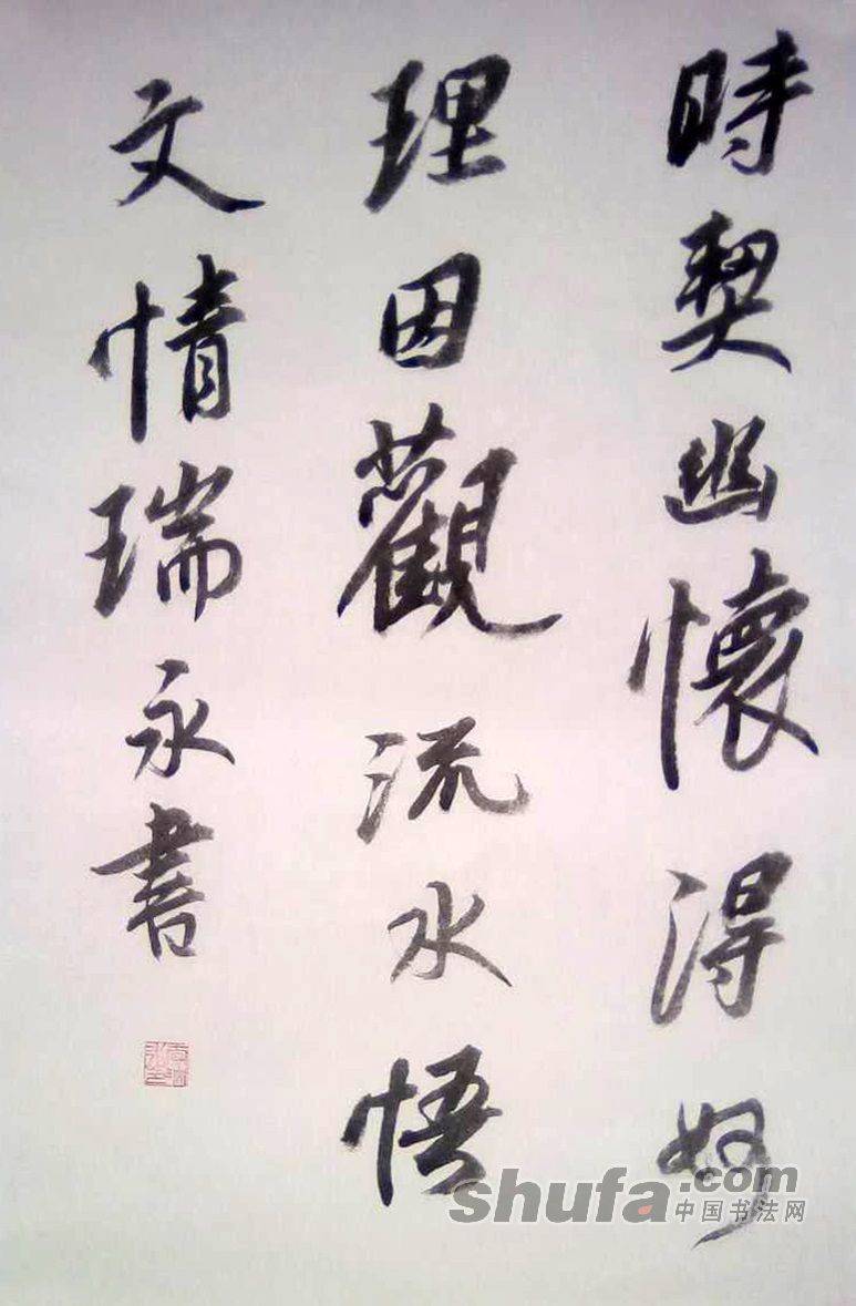 李瑞永作品,敬请点评!058作品尺寸70×46厘米,珠光云母宣,胡开文墨锭。释文“时契幽怀得妙理,因观流水悟文情。瑞永书”