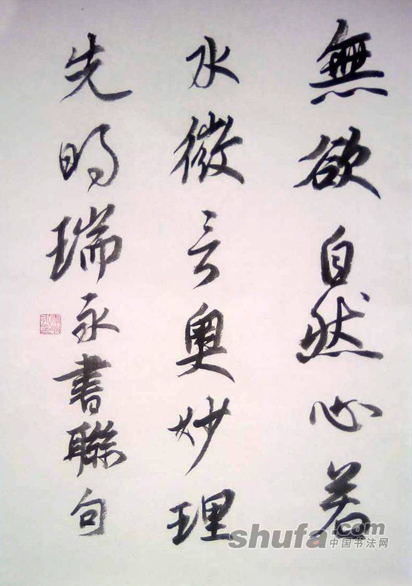 李瑞永作品,敬请点评!060作品尺寸70×46厘米,珠光云母宣,胡开文墨锭。释文“无欲自然心若水,微言奥妙理先明。瑞永书联句”