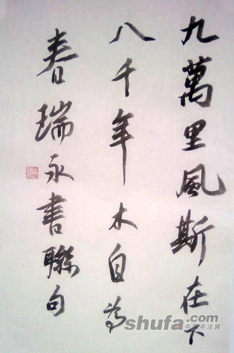 李瑞永作品,敬请点评!061作品尺寸70×46厘米,珠光云母宣,胡开文墨锭。释文“九万里风斯在下,八千年木自为春。瑞永书联句”