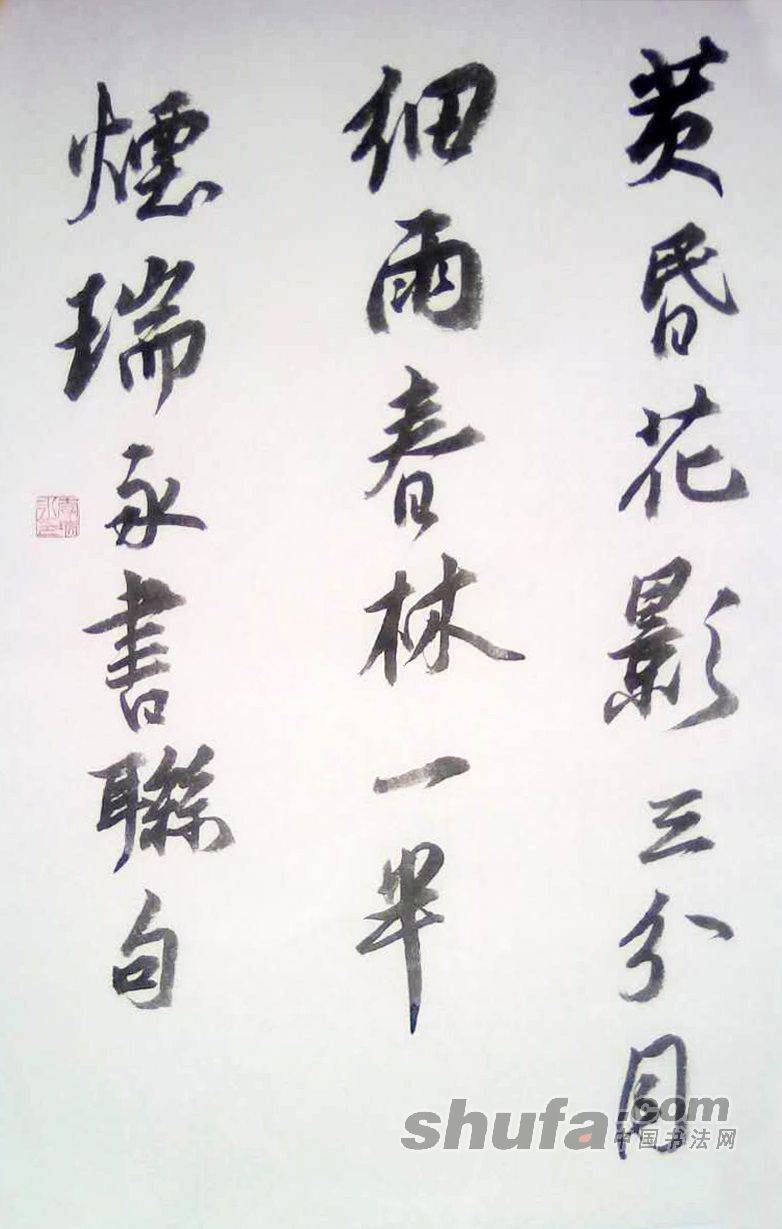 李瑞永作品,敬请点评!062作品尺寸70×46厘米,珠光云母宣,胡开文墨锭。释文“黄昏花影三分月,细雨春林一半烟。瑞永书联句”
