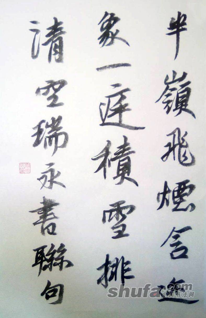 李瑞永作品,敬请点评!064作品尺寸70×46厘米,珠光云母宣,胡开文墨锭。释文“半岭飞烟含迹象,一庭积雪排清空。瑞永书联句”