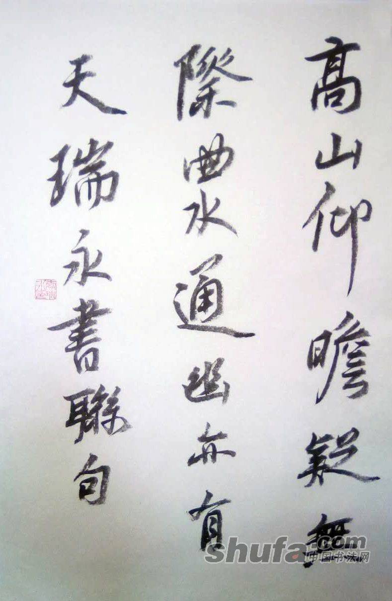 李瑞永作品,敬请点评!072作品尺寸70×46厘米,珠光云母宣,胡开文墨锭。释文“高山仰瞻疑无际,曲水通幽亦有天。瑞永书联句”