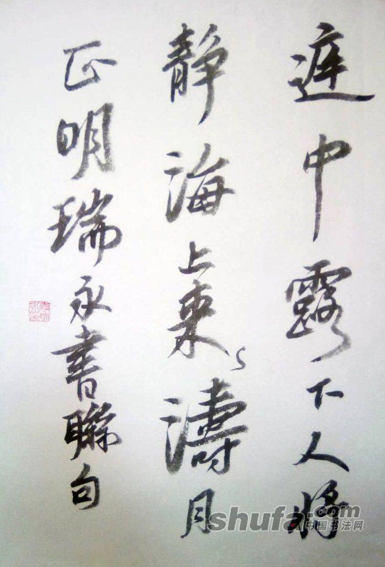 李瑞永作品,敬请点评!076作品尺寸70×46厘米,珠光云母宣,胡开文墨锭。释文“庭中露下人将静,海上涛来月正明。瑞永书联句”