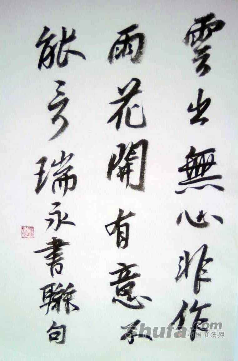 李瑞永作品,敬请点评!081作品尺寸70×46厘米,珠光云母宣,胡开文墨锭。释文“云出无心非作雨,花开有意不能言。瑞永书联句”