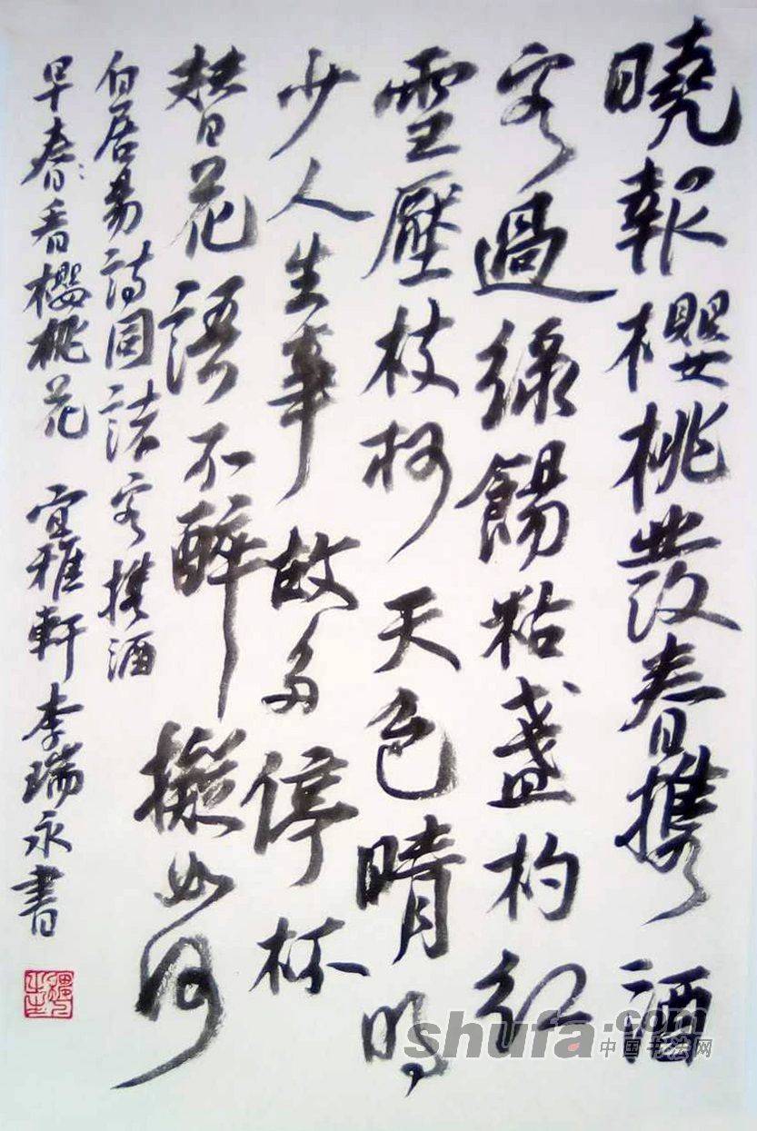 李瑞永作品,敬请点评!086作品尺寸70×46厘米,珠光云母宣,胡开文墨锭。释文“晓报樱花发,春携酒客过。绿饧粘盏杓,红雪压枝柯。天色清明少,人生亊故多。停杯替花语,不醉拟如何?白居易同诸客携酒早看樱桃花”
