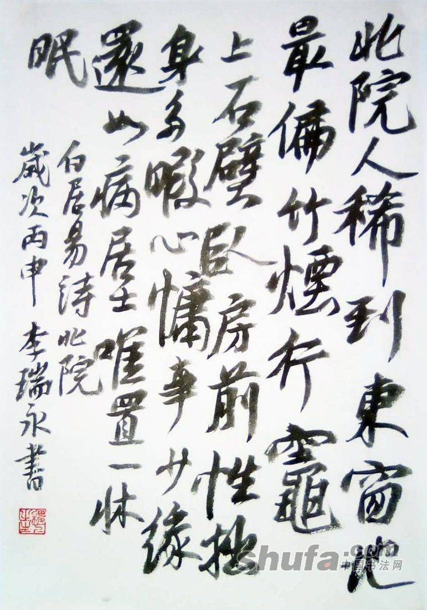 李瑞永作品,敬请点评!087作品尺寸70×46厘米,珠光云母宣,胡开文墨锭。释文“北院人稀到,东窗地最偏。竹烟行灶上,石壁卧房前。性拙身多暇,心慵亊少缘。还如病居士,唯置一床眠。白居易诗北院”
