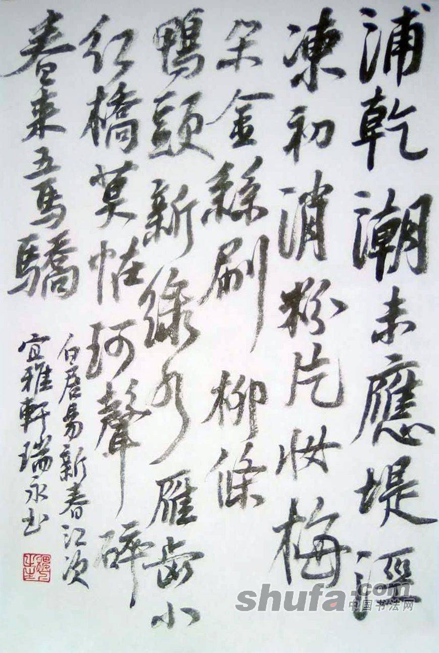 李瑞永作品,敬请点评!089作品尺寸70×46厘米,珠光云母宣,胡开文墨锭。释文“浦干潮未应,堤泾冻初消。粉片妆梅朵,金丝刷栁条。鸭头新绿水,雁齿小红桥。莫怪珂声碎,春来五马骄。白居易新春江次”