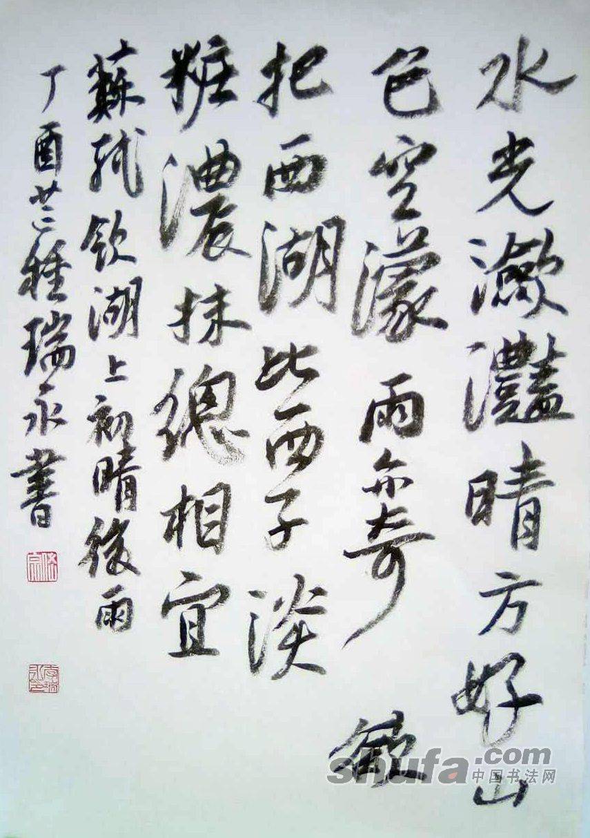李瑞永作品,敬请点评!099作品尺寸70×46厘米,珠光云母宣,胡开文墨锭。释文“水光潋滟晴方好,山色空濛雨亦奇。欲把西湖比西子,淡粧浓抹总相宜。苏轼饮湖上初晴后雨”