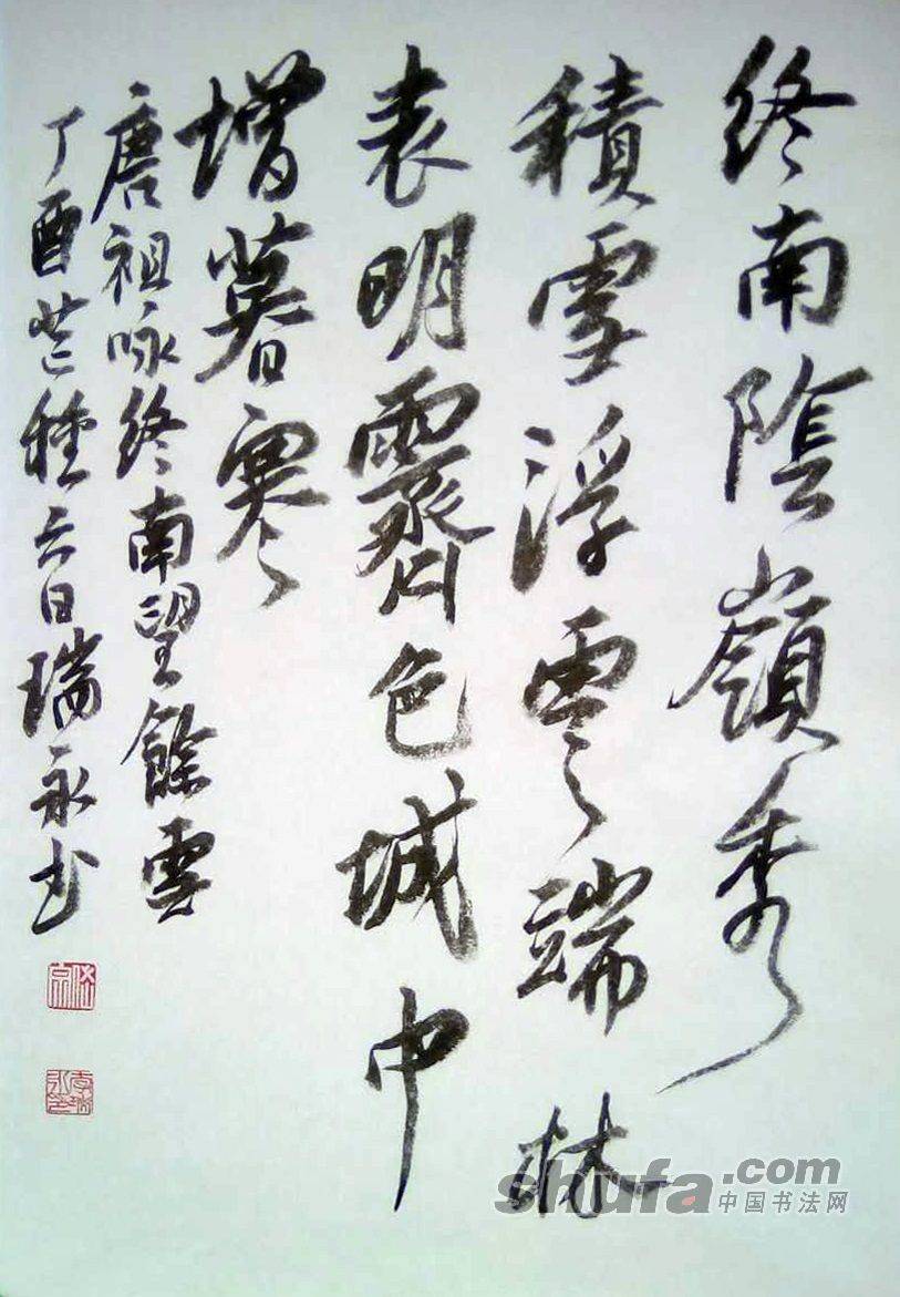 李瑞永作品,敬请点评!104作品尺寸70×46厘米,珠光云母宣,胡开文墨锭。释文“终南阴岭秀,積雪浮云端。林表明霁色,城中增暮寒。祖咏终南望馀雪”