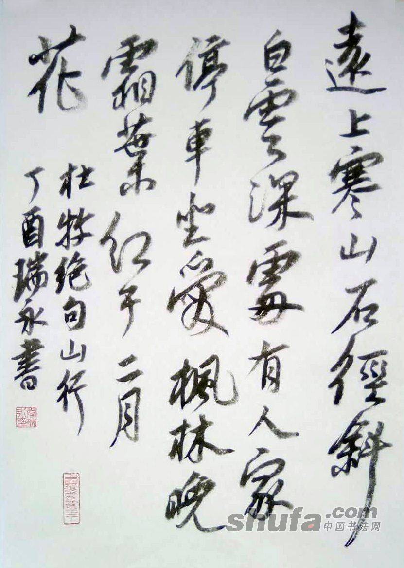 李瑞永作品,敬请点评!107作品尺寸70×46厘米,珠光云母宣,胡开文墨锭。释文“远上寒山石径斜,白云深处有人家。停车坐爱枫林晚,霜叶红于二月花。杜牧诗山行”