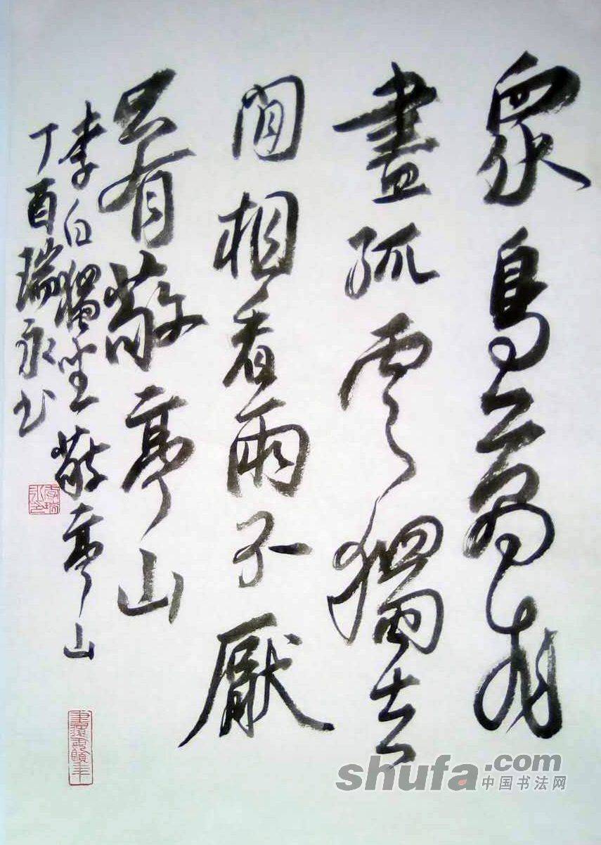 李瑞永作品,敬请点评!108作品尺寸70×46厘米,珠光云母宣,胡开文墨锭。释文“众鸟高飞尽,孤云独去闲。相看两不厌,只有敬亭山。李白独坐敬亭山”