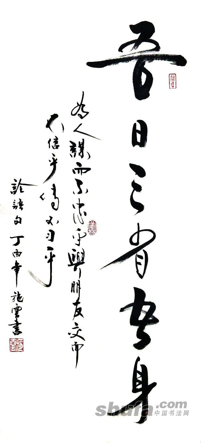 吾日三省吾身--为人谋而不忠乎?与朋友交而不信乎?传不习乎? 译文:我每天多次反省自己的言行,替人家谋划的事不尽心尽力吗?和朋友交往不诚心诚意吗?我从老师那里学到的,有没有时时温习、实践呢? 施云作品,敬请点评!