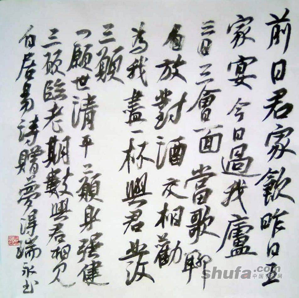 李瑞永作品,敬请点评!118作品尺寸70×70厘米,珠光云母宣,胡开文墨锭。释文“前曰君家饮,昨曰王家宴。今曰过我庐,三曰三会面。当歌聊自放,对酒交相劝。为我尽一杯,与君发三愿。一愿世清平,二愿身强健。三愿临老期,数与君相见。白居易赠夢得”