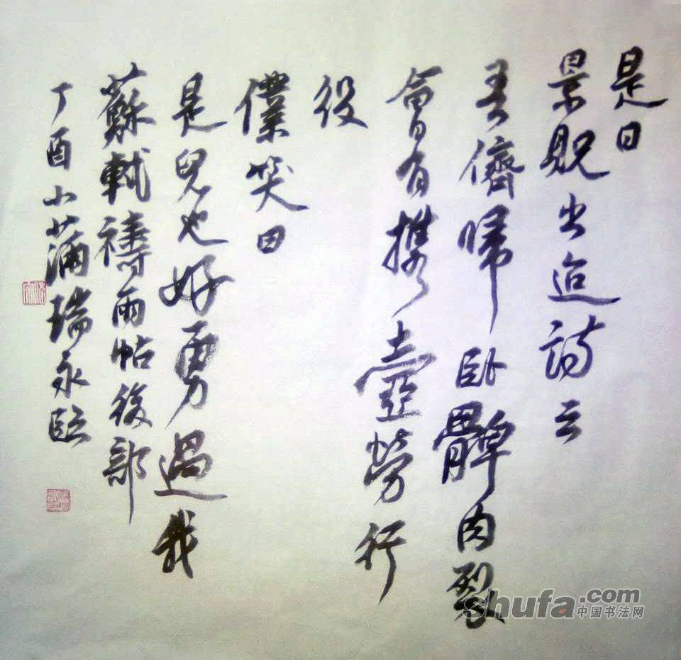 李瑞永作品,敬请点评!125作品尺寸70×70厘米,珠光云母宣,胡开文墨锭。释文“是日,景贶出迨诗。云 :“吾侪归卧髀肉裂,会有携壶劳行役”仆笑曰:“是儿也好勇过我”苏轼祷雨帖后部”