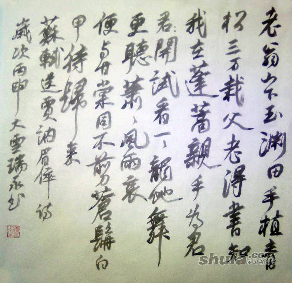李瑞永作品,敬请点评!129作品尺寸70×70厘米,珠光云母宣,胡开文墨锭。释文“老翁山下玉渊田,手植青松三万栽。父老得书知我在,蓬蒿亲手为君开。试看一一龙蛇舞,更听萧萧风雨哀。便与甘棠同不剪,苍髯白甲待归来。苏轼送贾讷眉倅诗”
