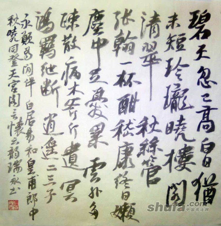 李瑞永作品,敬请点评!130作品尺寸70×70厘米,珠光云母宣,胡开文墨锭。释文“碧天忽已高,白曰犹未短。玲珑晓楼阁,清翠秋丝管。张翰一杯酣,嵇康终曰懒。尘中足忧累,云外多疎散。病木斧斤遗,冥鸿羁绁断。逍遥二三子,永愿为闲伴。白居易和皇甫郎中秋晓同登天宫阁言怀六韵”