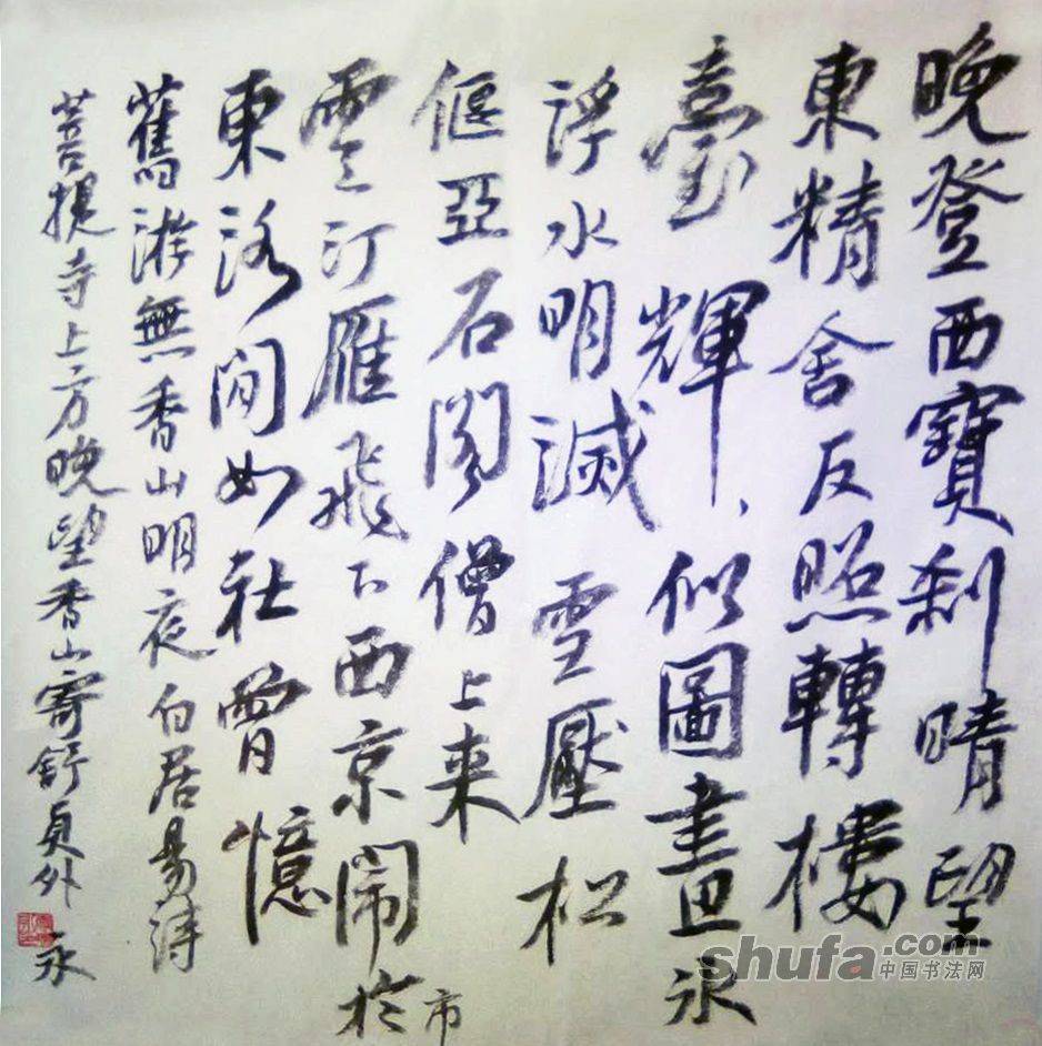 李瑞永作品,敬请点评!132作品尺寸70×70厘米,珠光云母宣,胡开文墨锭。释文“晚登西宝刹,晴望东精舍。反照转楼台,辉辉似图画。冰浮水明滅,雪压松偃亚。石阁僧上来,雪汀雁飞下。西京闹于市,东洛闲如社。曾忆旧游无,香山明月夜。白居易诗菩提寺上方晚望香山寄舒员外”