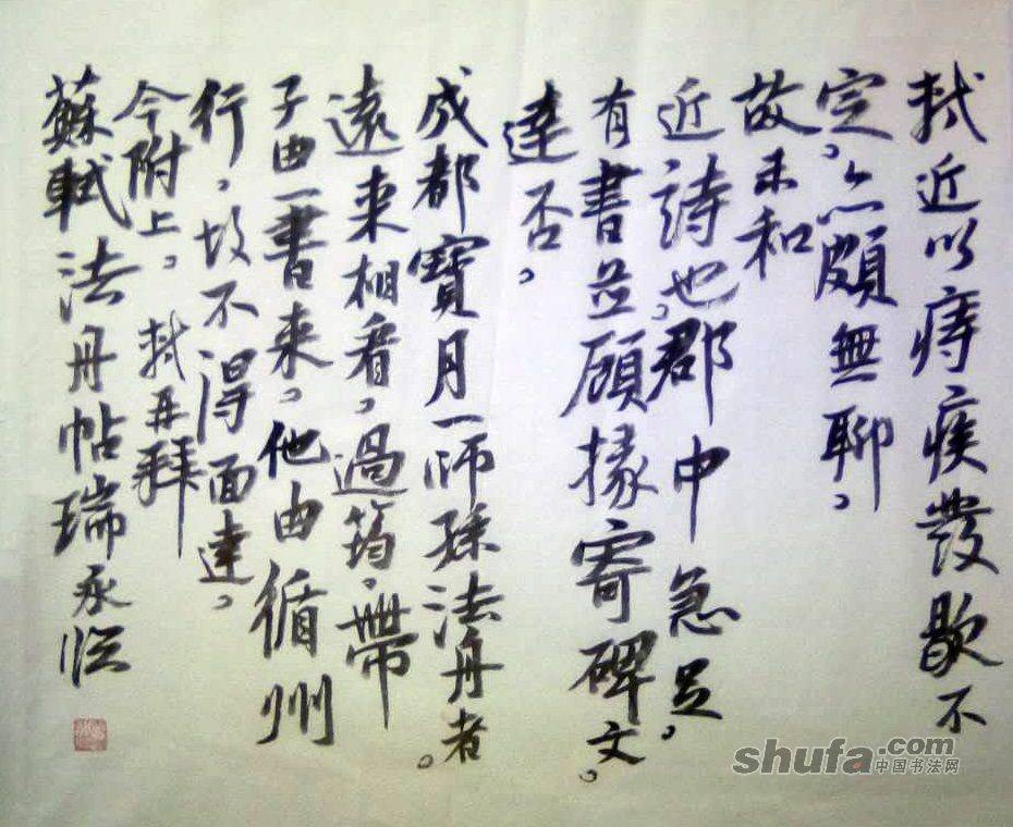李瑞永作品,敬请点评!141作品尺寸73×65厘来,珠光云母宣,胡开文墨锭。释文“轼近以痔疾发歇不定,亦颇无聊,故未和近诗也。郡中急足,有书并顾掾寄碑文,违否?成都宝月一师孙法舟者,远来相看。过筠,带子由书来。他由循州行,故不得面达。今附上。轼再拜。苏轼法舟帖”