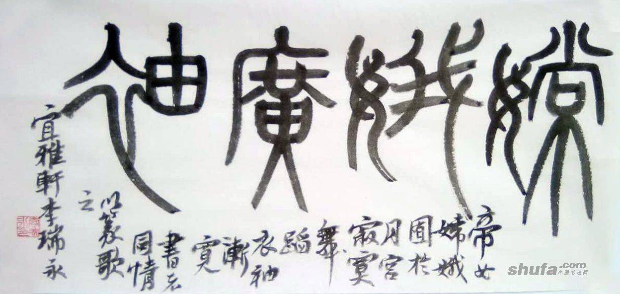 李瑞永作品,敬请点评!153作品尺寸65×33厘米。篆文“嫦娥广袖”行书“帝女媂娥囿于月宫,寂寞舞蹈,衣袖渐宽。书者同情,从篆歌之。”