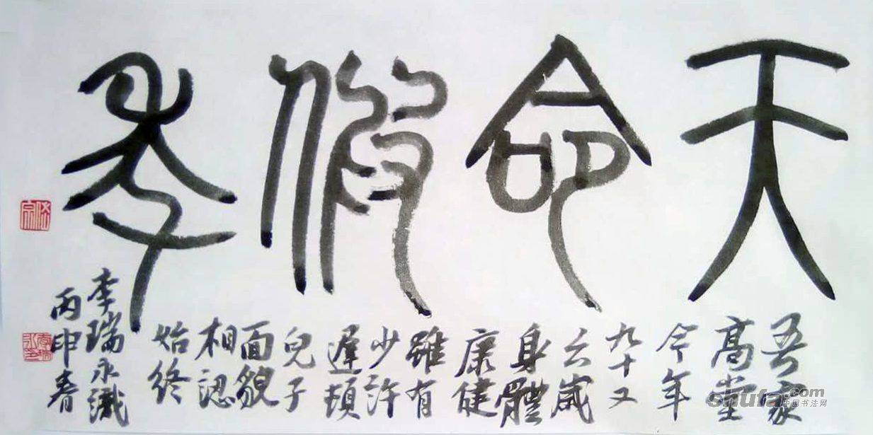李瑞永作品,敬请点评!159作品尺寸65×33厘米。篆文“天命假年”行书“吾家高堂,今年九十又六岁。身体康健,虽有少许迟顿,儿子面貌相认始终。”