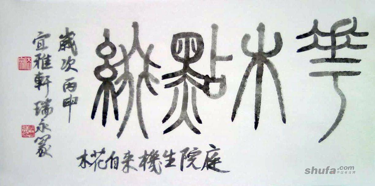 李瑞永作品,敬请点评!180作品尺寸65×33厘米。篆文“花木点缀”行书“庭院生机来自花木”