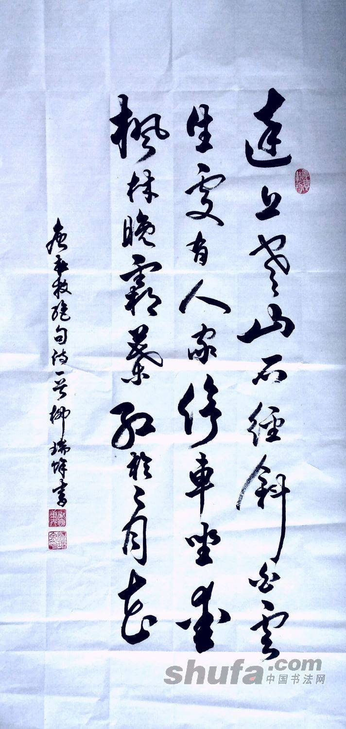 柳瑞余作品,释文:唐杜牧诗,远上寒山石径斜,白云生处有人家,停车坐爱枫林晚,霜叶红于二月花。行草竖幅中堂。