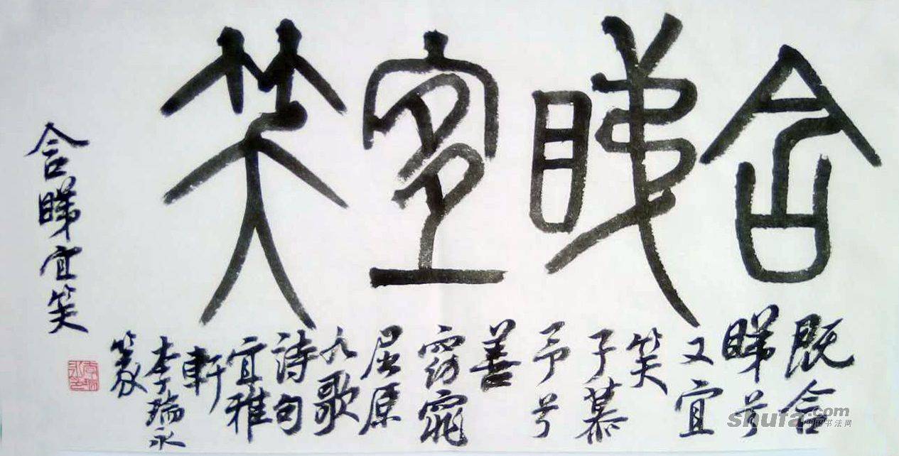 李瑞永作品,敬请点评!194作品尺寸63×31厘米。篆文“含睇宜笑”行书“既含睇兮又宜笑,子慕予兮善窈窕。屈原九歌诗句。”